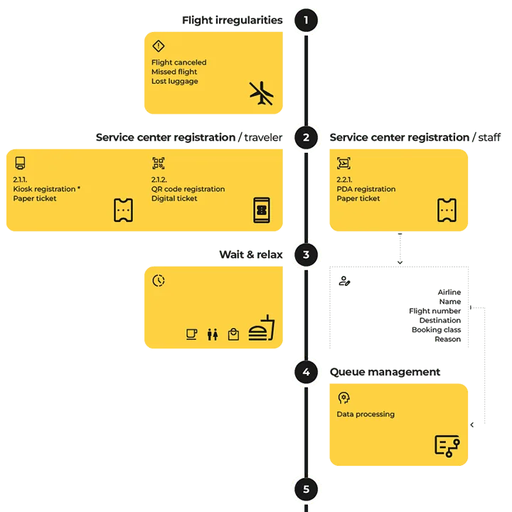 Після вибору послуги пасажири отримують нумерований квиток, який ефективно направляє їх до призначеної зони обслуговування.