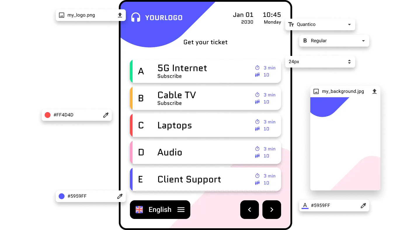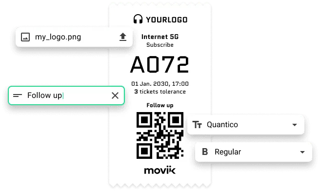 Платформа QCherga створена з самого початку бути максимально гнучкою; ви можете налаштувати все відповідно до ваших потреб. Готова до налаштування за лічені хвилини. Ваш паперовий квиток буде унікальним.