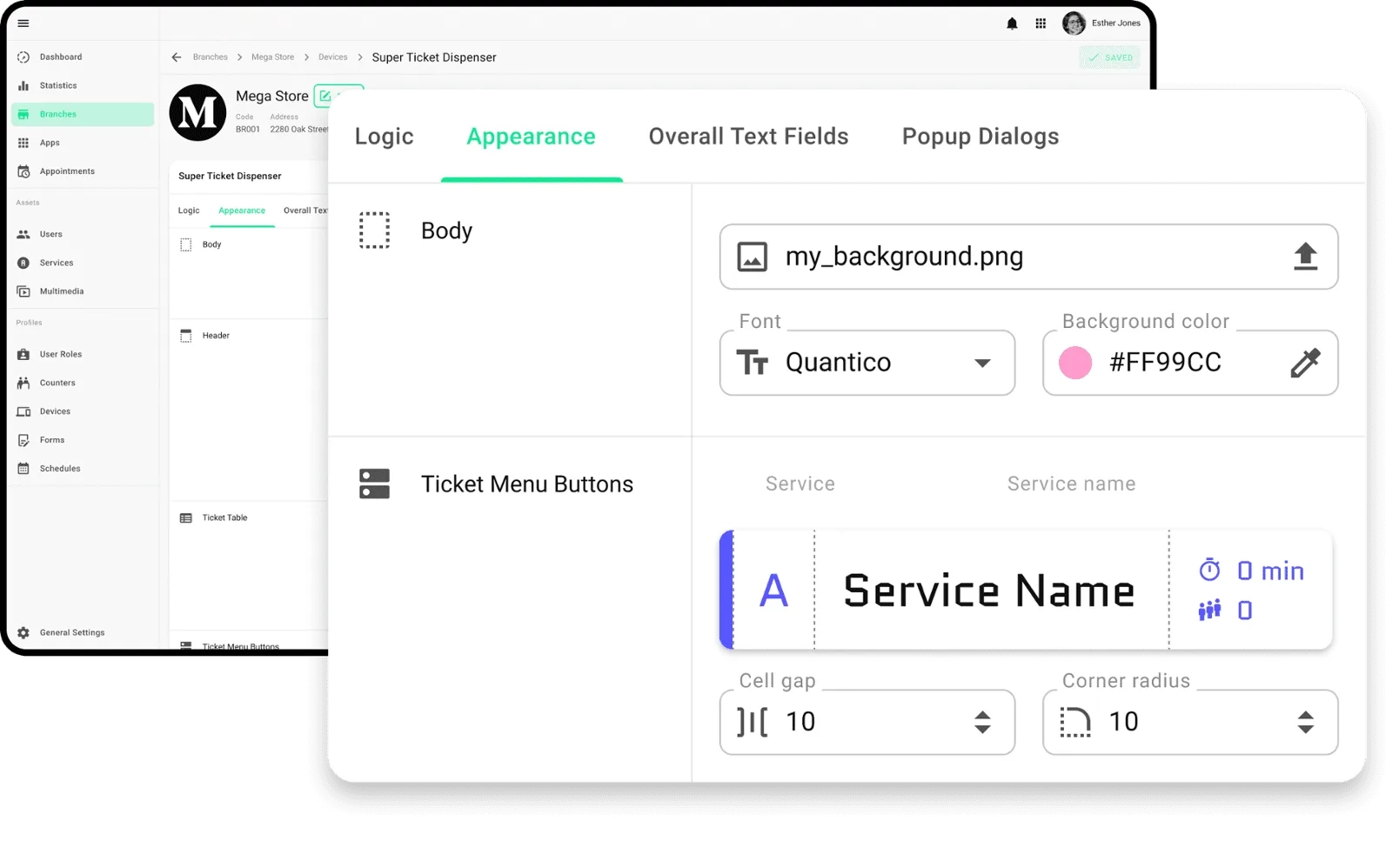 Виберіть ідеальний макет, щоб відображення на ваших автоматах для видачі квитків відповідало стилю вашого бренду. У вас є інструменти для налаштування вигляду та відчуття, кольору, пріоритету, часу очікування, кількості людей тощо.